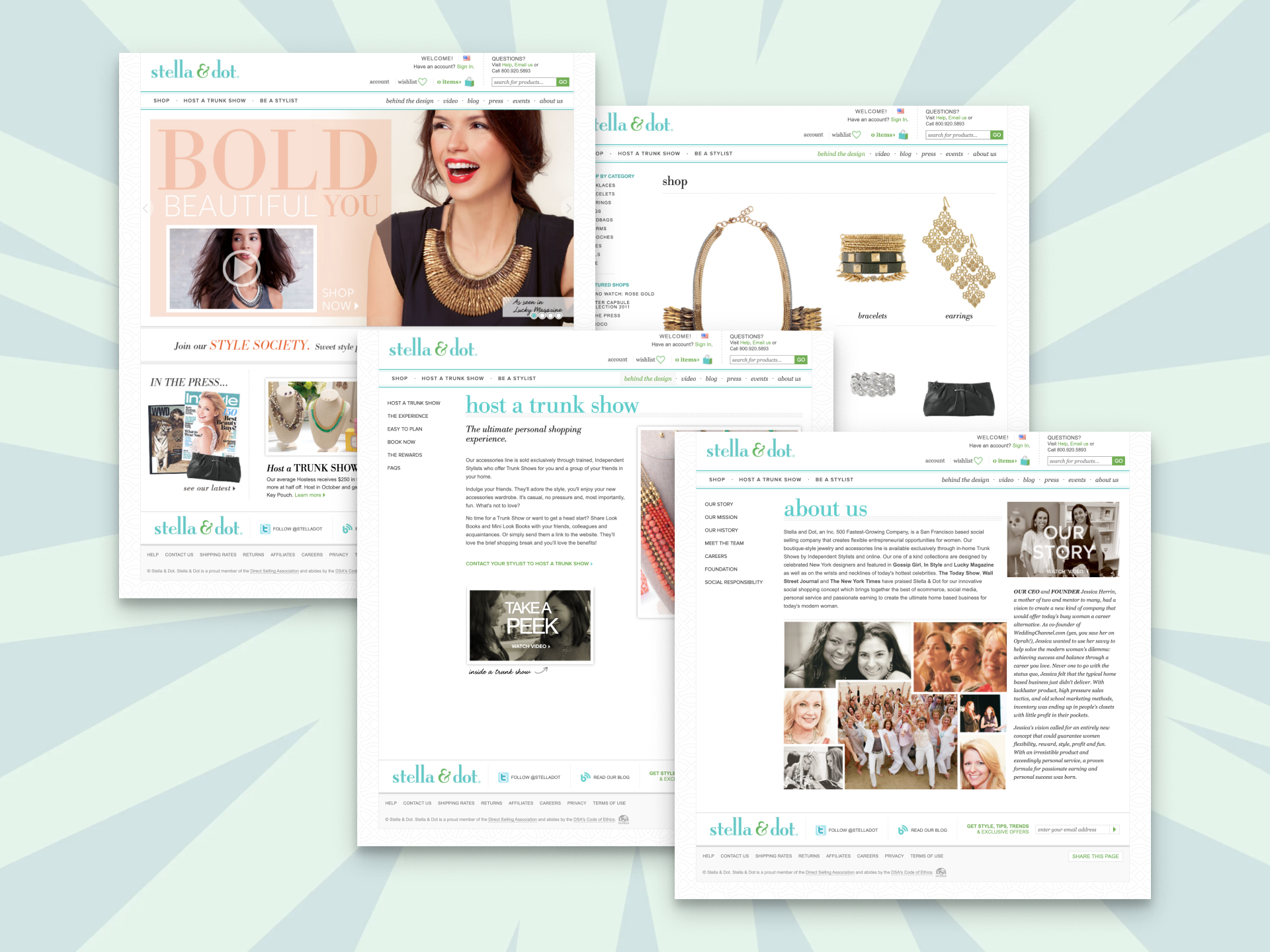 Stella & Dot was a social-selling jewelry brand with two audiences: customers shopping for jewelry and independent stylists building their businesses. We built a Magento-powered e-commerce store and a creator content site, called Stella & Dot University. Two sister sites sharing a cohesive brand.