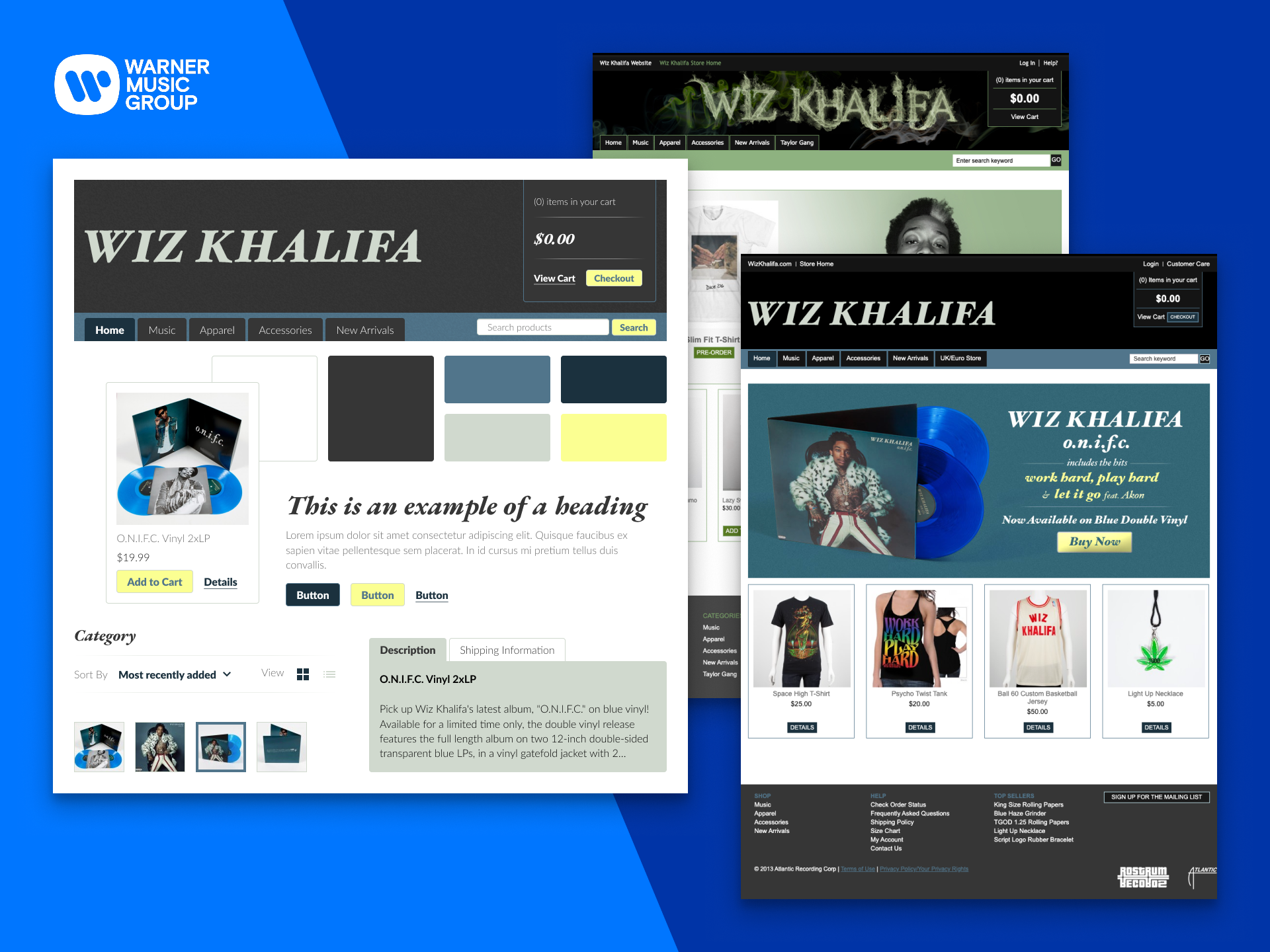 Each artist had visual elements rooted in album art, photography, and print. I adapted those into storefront templates for responsive screens. For the Wiz Khalifa store, I pulled from his existing site's photography and color palette and reworked the storefront UI to match, so the store felt like part of his world rather than a separate destination.